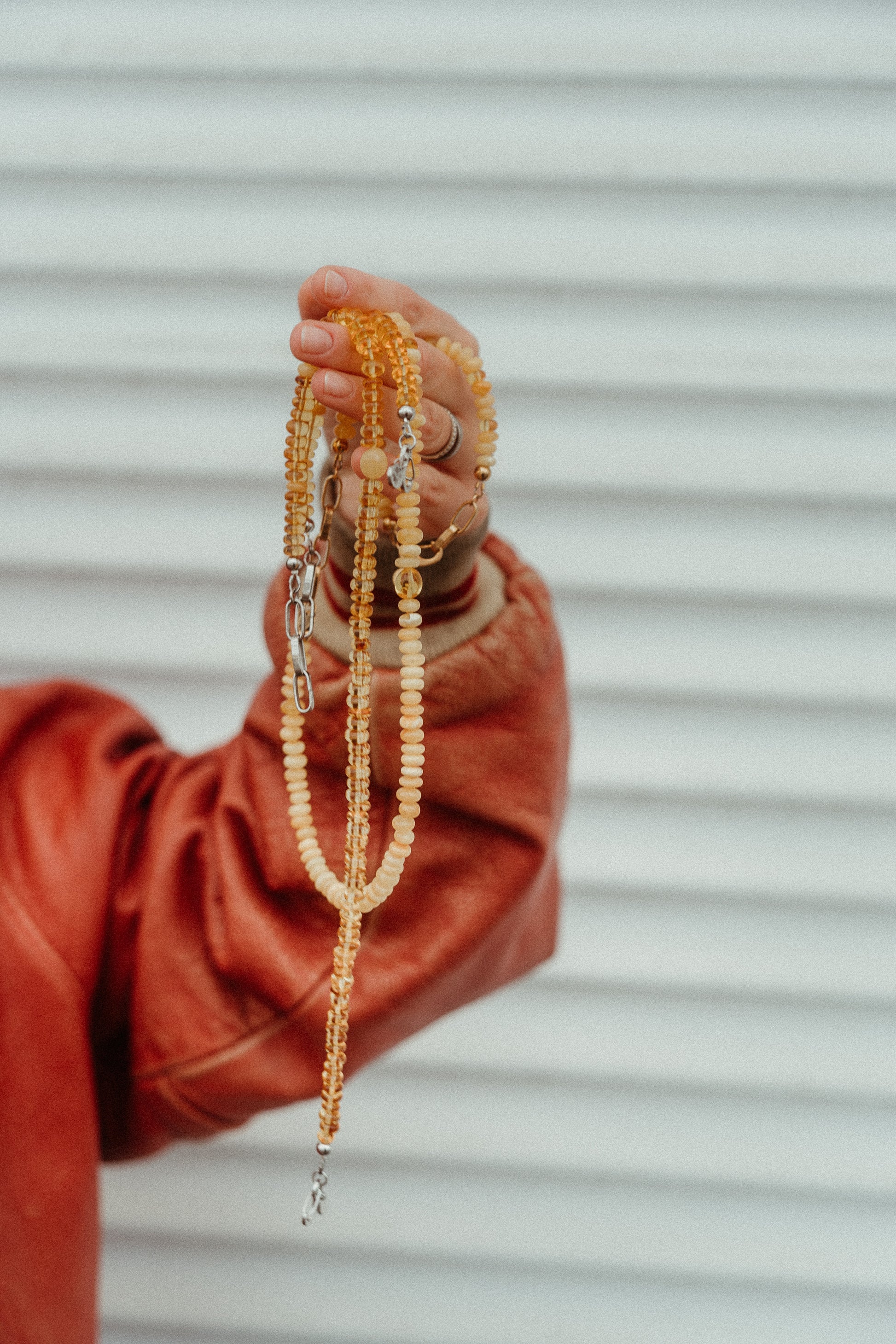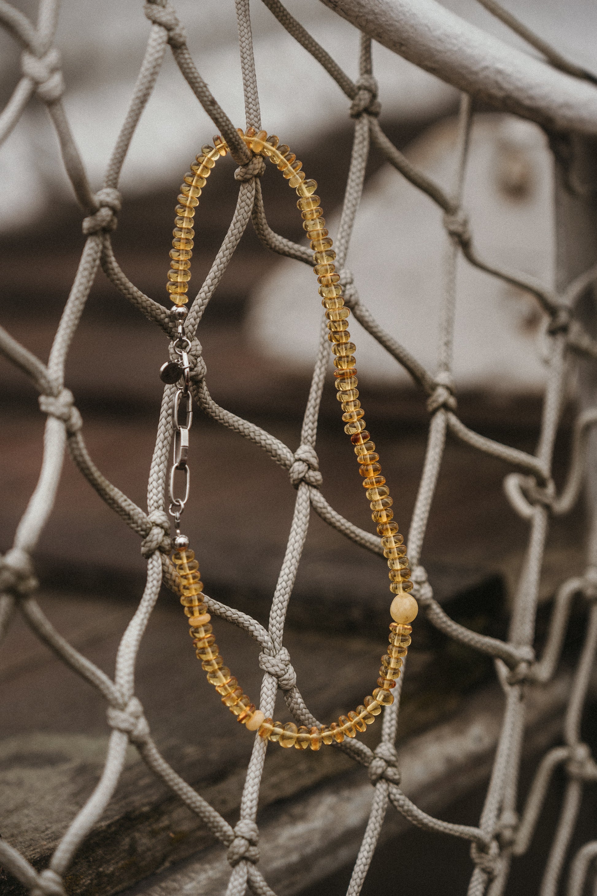 Całość dopełnia industrialne zapięcie, wprowadzające nowoczesny, lekko streetowy akcent, który przełamuje klasykę bursztynu i nadaje naszyjnikowi niepowtarzalny styl.